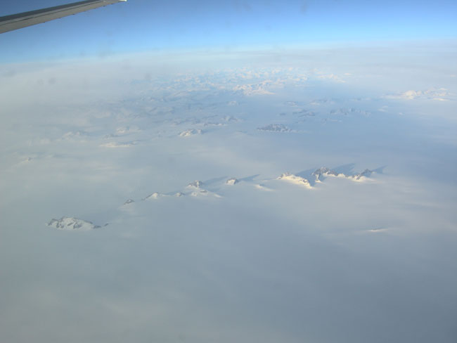 | Peaks of mountains just peek above the Greenland ice in the early morning. | ![]() |